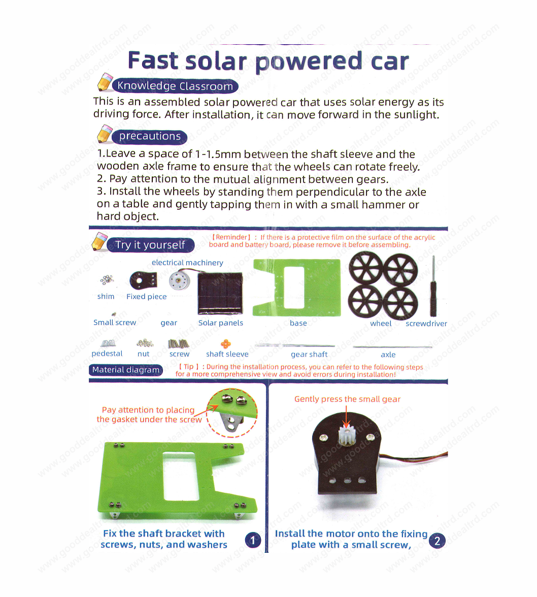 DIY Assembly Kit: Includes all necessary components—solar panel, motor, base plate, gears, wheels, shaft sleeve, and screws—allowing children to build the car themselves and gain a sense of accomplishment.